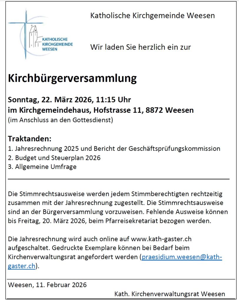 Kirchenverwaltung Kath. Kirchenverwaltung – PräsidiumPräsident Alex BühlerSpittelstrasse 18 8872 Weesen *protected email* Kath. Kirchenverwaltung – FinanzenVizepräsidentin Irene Helbling *protected email* Kath. Kirchenverwaltung – LiegenschaftenManuela Baumgartner *protected email* Kath. Kirchenverwaltung – KirchgemeindehausFernanda Walser *protected email* Kath. Kirchenverwaltung – Personal/BeisitzMaria Danieletto *protected email* Kath. Kirchenverwaltung – AktuariatRegula Hanimann *protected email* FinanzverwaltungJennifer BisquolmHofstrasse 2 8872 WeesenTelefon: 055 616 52 49 *protected email*Einladung Bürgerversammlung, Sonntag, 22. März 2026, 11.15 UhrEinladung als PDF zum Herunterladen Protokoll Bürgerversammlung, 22. März 2026 Amtsbericht 2025 Amtsbericht 2024 Protokoll Bürgerversammlung, 30. März 2025